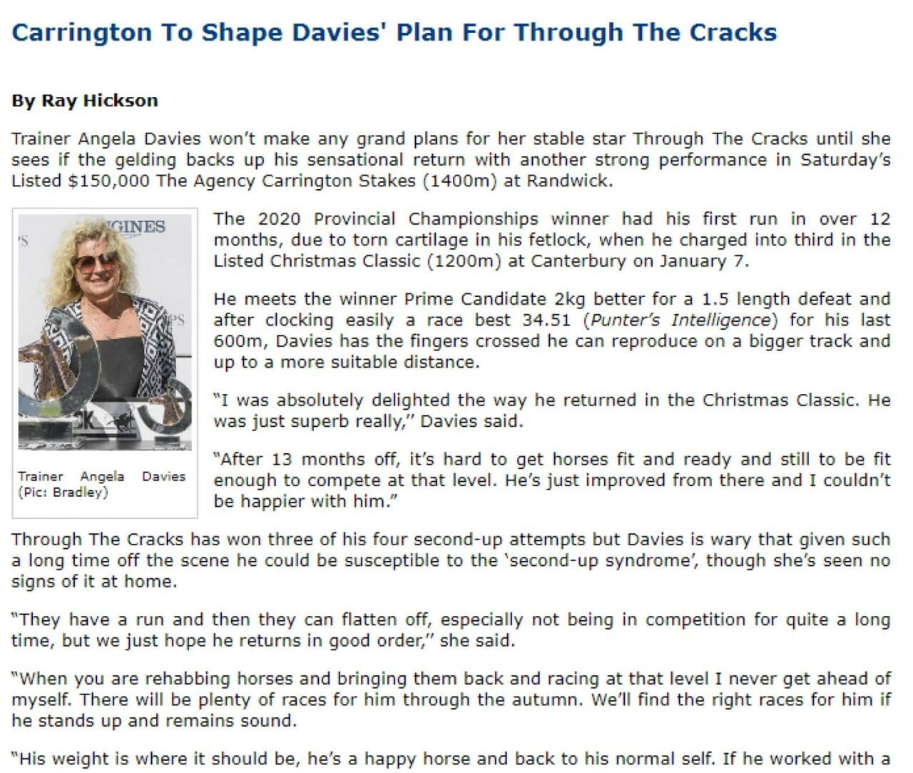 Through The Cracks will represent the stable on Saturday the 12th of November in “The “Hunter” over 1300m. The Hunter is a million dollar race with $580,000 going to the winner.